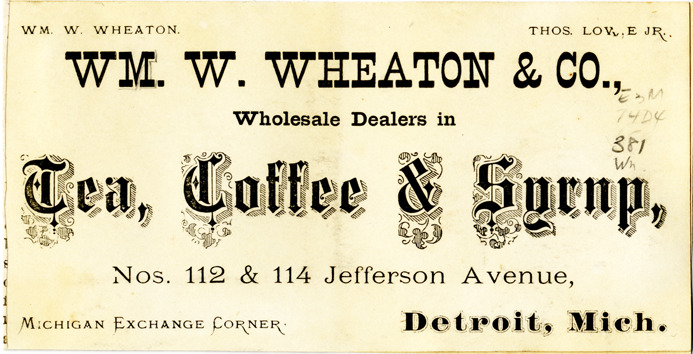 Favorite this☆ Business card for Wm. W. Wheaton & Co. Description: View of a business card for Wm. W. Wheaton & Co. Printed on front: "Wm. W. Wheaton & Co., wholesale dealers in tea, coffee & syrup. Nos. 112 & 114 Jefferson Avenue, Detroit, Mich. Exchange corner. Wm. W. Wheaton, Thos. Lowe, Jr." Details Resource ID: bh014688 Subject: Tea trade--Michigan--Detroit Coffee industry--Michigan--Detroit Business cards Date Issued: Unknown year Format: 1 business card ; 2.5 x 4.5 in. Member of: Burton Historical Collection Filing Location: E&M 977.4D4 381 W Rights: Physical rights are retained by DPL. Copyright is retained in accordance with U.S. copyright laws.