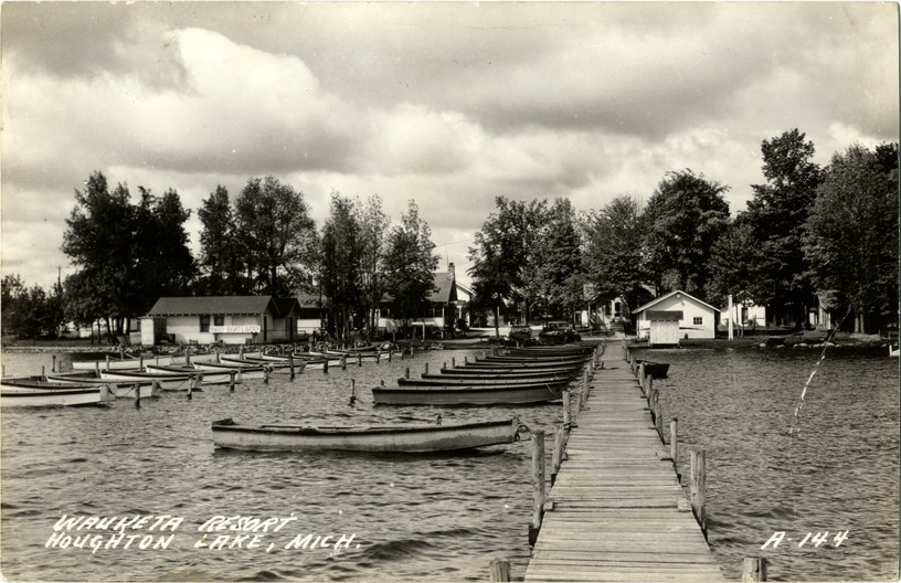 View of boats moored to docks at the Wauketa Resort in Houghton Lake, Michigan. Printed on front: "Wauketa Resort, Houghton Lake, Mich."