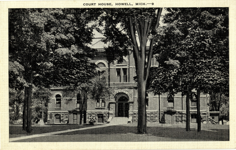 View of the Livingston County Courthouse in Howell, Michigan. Printed on front: "Court House, Howell, Mich." Printed on back: "Made in U.S.A. by E.C. Kropp Co., Milwaukee, Wis."