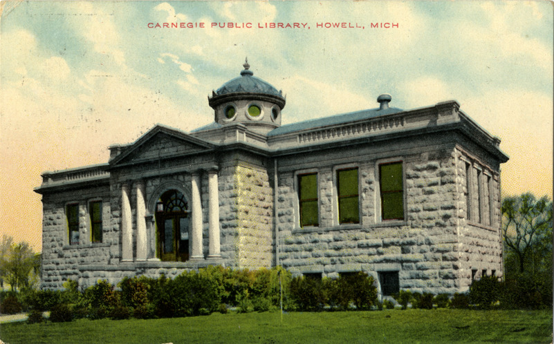 View of the Public Library in Howell, Michigan. Printed on front: "Carnegie Public Library, Howell, Mich." Printed on back: "Pub. by C.S. Line." Handwritten on back: "Howell, Mar. 9, 1910. Dear May, Jesse has been very sick. Clarene and the neighbors and myself has taken care of him. When you come home you will come on the train. He is out of danger the Doctor say. Mother."