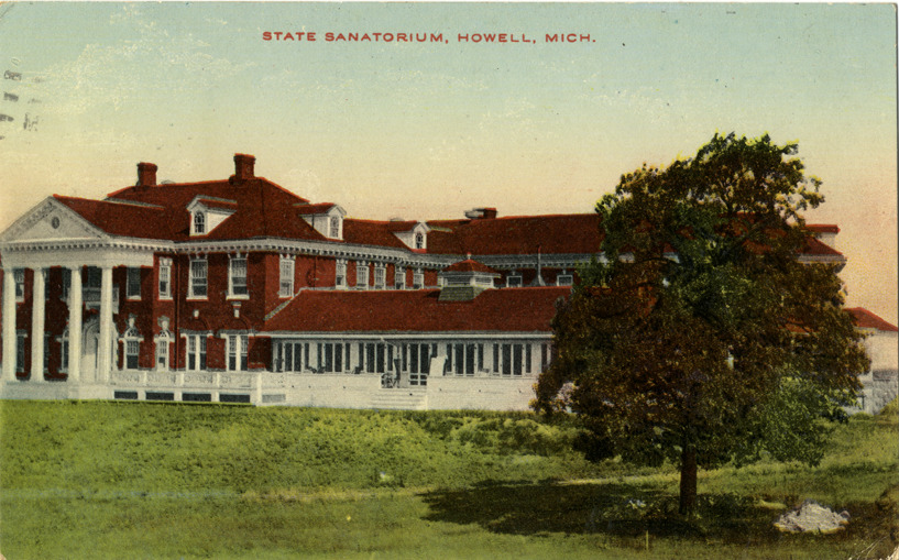 View of the Michigan State Sanatorium in Howell, Michigan. Printed on front: "State Sanatorium, Howell, Mich." Printed on back: "Pub. by C.S. Line." Handwritten on back: "Howell, Mich. April 11, 1912. Dear May, Your card and one for you from Aunt Mary to you came last night. I will send the [undecipherable] with my card. Jesse is threshing his cloves seed today. Mrs. Camfield called a few days ago she enjoys her place at [undecipherable] very much. Good by from Mother."