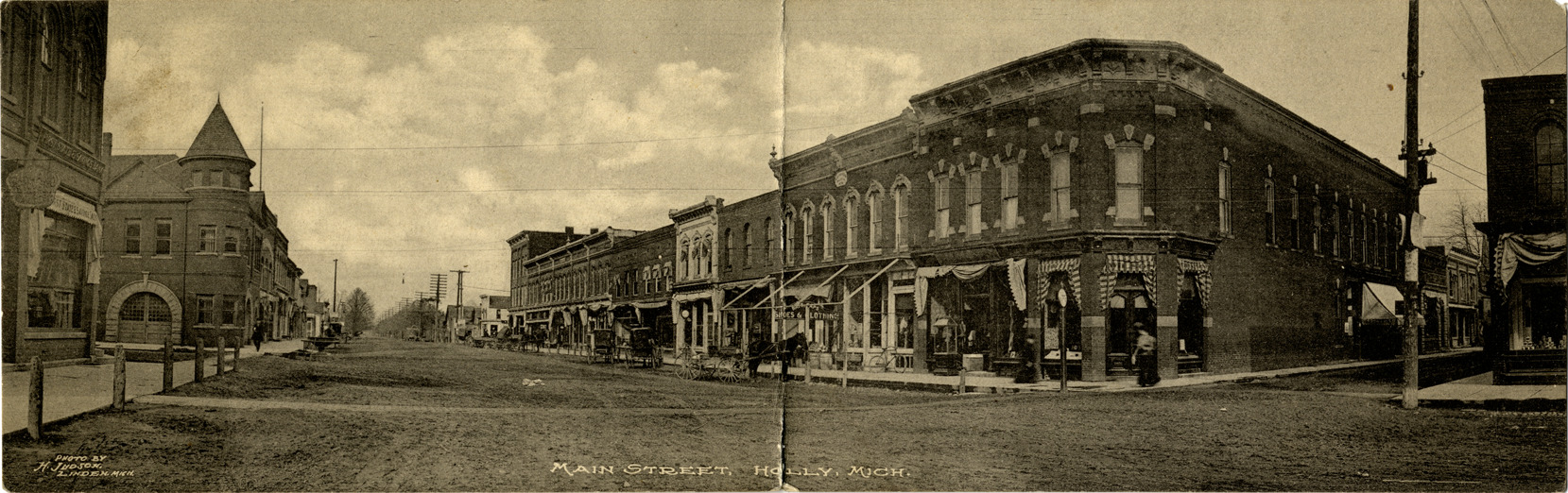 View of commercial buildings on Main St. in Holly, Michigan. Printed on front: "Main Street, Holly, Mich. Photo by H. Judson, Linden, Mich." Printed on back: "The Albertype Co., Brooklyn, N.Y."
