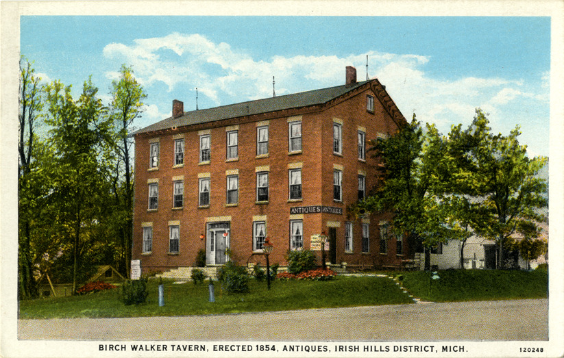 Favorite this☆ Birch Walker Tavern, Irish Hills, Michigan Description: View of the Birch Walker Tavern in the Irish Hills district of Michigan. Printed on front: "Birch Walker Tavern, erected 1854, antiques, Irish Hills District, Mich." Printed on back: "Made by Curt Teich & Co., Inc., Chicago, U.S.A." Details Resource ID: bh014827 Subject: Taverns (Inns)--Michigan--Irish Hills Postcards Publisher: Curt Teich & Co. Date Issued: Unknown year Format: 1 postcard : col. ; 3.5 x 5.5 in. Member of: Burton Historical Collection Filing Location: M/Localities-Irish Hills Rights: Physical rights are retained by DPL. Copyright is retained in accordance with U.S. copyright laws.