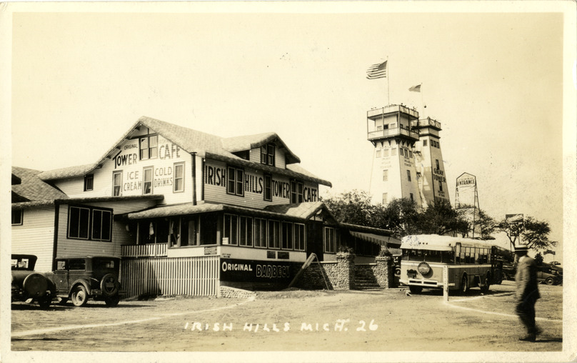 Favorite this☆ Irish Hills Tower Cafe, Irish Hills, Michigan Description: View of a bus parked in front of the Irish Hills Tower Cafe in the Irish Hills district of Michigan. Irish Hills Towers in background. Printed on front: "Irish Hills, Mich." Details Resource ID: bh014832 Subject: Restaurants--Michigan--Irish Hills Buses--Michigan--Irish Hills Observation towers--Michigan--Irish Hills Photographic prints Postcards Date Issued: Unknown year Format: 1 postcard ; 3.5 x 5.5 in. Member of: Burton Historical Collection Filing Location: M/Localities-Irish Hills Rights: Physical rights are retained by DPL. Copyright is retained in accordance with U.S. copyright laws.