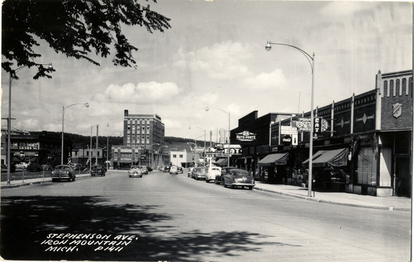View of cars and commercial buildings on Stephenson Ave. in Iron Mountain, Michigan. Printed on front: "Stephenson Ave., Iron Mountain, Mich." Printed on back: "All rights reserved. The L.L. Cook Co., Milwaukee." Handwritten on back: "Dear Davey, I had rather a miserable ride over - rained nearly all the way and then I ran into a 13 mile stretch of road construction. It was so like a washboard I had to slow down to 20 miles an hour. More later. Daddy." Card is postmarked May 12, 1952.