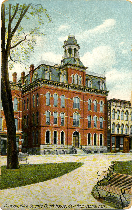Favorite this☆ Jackson County Courthouse, Jackson, Michigan Description: View of the Jackson County Courthouse in Jackson, Michigan. Printed on front: "Jackson, Mich. County Court House, view from Central Park." Printed on back: "The Hugh C. Leighton Co., manufacturers, Portland, Me., U.S.A. Made in Germany 8596." Details Resource ID: bh014880 Subject: Courthouses--Michigan--Jackson Postcards Publisher: Hugh C. Leighton Co. Date Issued: Unknown year Format: 1 postcard : col. ; 5.5 x 3.5 in. Member of: Burton Historical Collection Filing Location: M/Localities-Jackson Rights: Physical rights are retained by DPL. Copyright is retained in accordance with U.S. copyright laws.