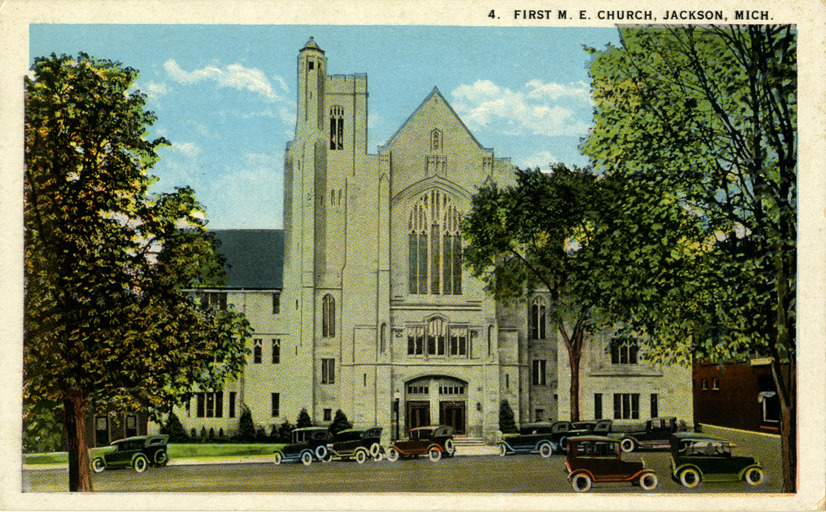 View of cars parked in front of the First Methodist Episcopal Church in Jackson, Michigan. Printed on front: "4. First M.E. Church, Jackson, Mich." Printed on back: "Published by Harry H. Hamm, Toledo, Ohio. Made in U.S.A. H.H. Hamm, Toledo, Ohio. C.T. American Art. CT Co., Chicago."