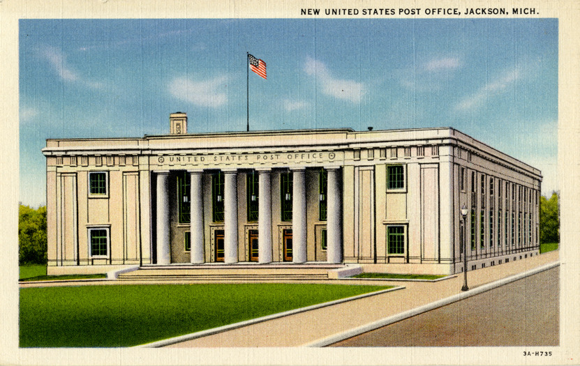 Favorite this☆ U.S. Post Office, Jackson, Michigan Description: View of the U.S. Post Office in Jackson, Michigan. Printed on front: "New United States Post Office, Jackson, Mich." Printed on back: "W.J. Beardsley, Jackson, Mich. C.T. Art Colortone. Made only by Curt Teich & Co., Inc., Chicago, U.S.A." Details Resource ID: bh014885 Subject: Post office buildings--Michigan--Jackson Postcards Publisher: Wm. J. Beardsley Curt Teich & Co. Date Issued: Unknown year Format: 1 postcard : col. ; 3.5 x 5.5 in. Member of: Burton Historical Collection Filing Location: M/Localities-Jackson Rights: Physical rights are retained by DPL. Copyright is retained in accordance with U.S. copyright laws.