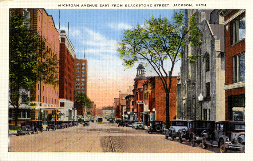Favorite this☆ Michigan Avenue, Jackson, Michigan Description: View of commercial buildings on Michigan Ave. in Jackson, Michigan. Printed on front: "Michigan Avenue east from Blackstone Street, Jackson, Mich." Printed on back: "Pub. by Wm. J. Beardsley, Jackson, Mich. Made in U.S.A." Details Resource ID: bh014908 Subject: Streets--Michigan--Jackson Commercial buildings--Michigan--Jackson Postcards Publisher: Wm. J. Beardsley Date Issued: Unknown year Format: 1 postcard : col. ; 3.5 x 5.5 in. Member of: Burton Historical Collection Filing Location: M/Localities-Jackson Rights: Physical rights are retained by DPL. Copyright is retained in accordance with U.S. copyright laws.
