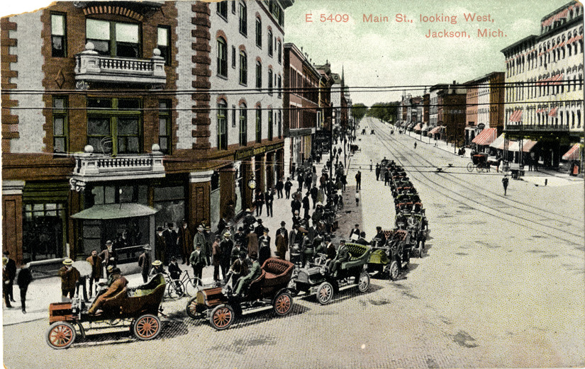 Favorite this☆ Automobiles on Main Street, Jackson, Michigan Description: View of cars lined up on Main St. in Jackson, Michigan. Commercial buildings in background. Printed on front: "E 5409. Main St., looking west, Jackson, Mich." Printed on back: "Published by Harck & Addison, Jackson, Mich. (Germany). SL & Co." Details Resource ID: bh014913 Subject: Streets--Michigan--Jackson Commercial buildings--Michigan--Jackson Automobiles--Michigan--Jackson Postcards Publisher: Harck & Addison Samuel Langdorf & Co. Date Issued: Unknown year Format: 1 postcard : col. ; 3.5 x 5.5 in. Member of: Burton Historical Collection Filing Location: M/Localities-Jackson Rights: Physical rights are retained by DPL. Copyright is retained in accordance with U.S. copyright laws.