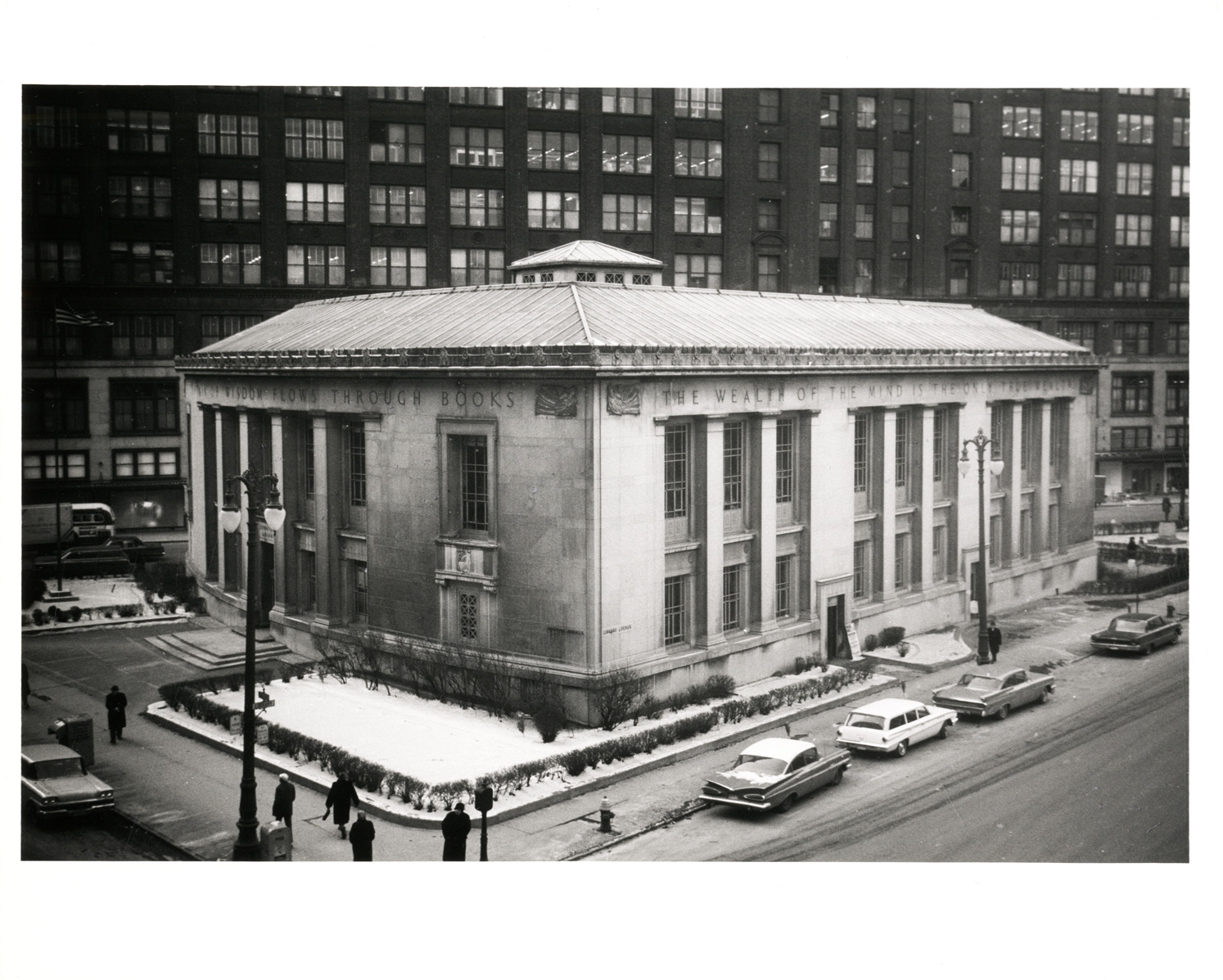 View of the Downtown Library, now known as the Skillman Branch, of the Detroit Public Library. Cars are parked in street. Stamped on back: "Benyas-Kaufman photographers. 3775 W. 9 Mile. Oak Park 37, Mich. Phone LI. 8-4400." Handwritten on back: "Jan. 1963."