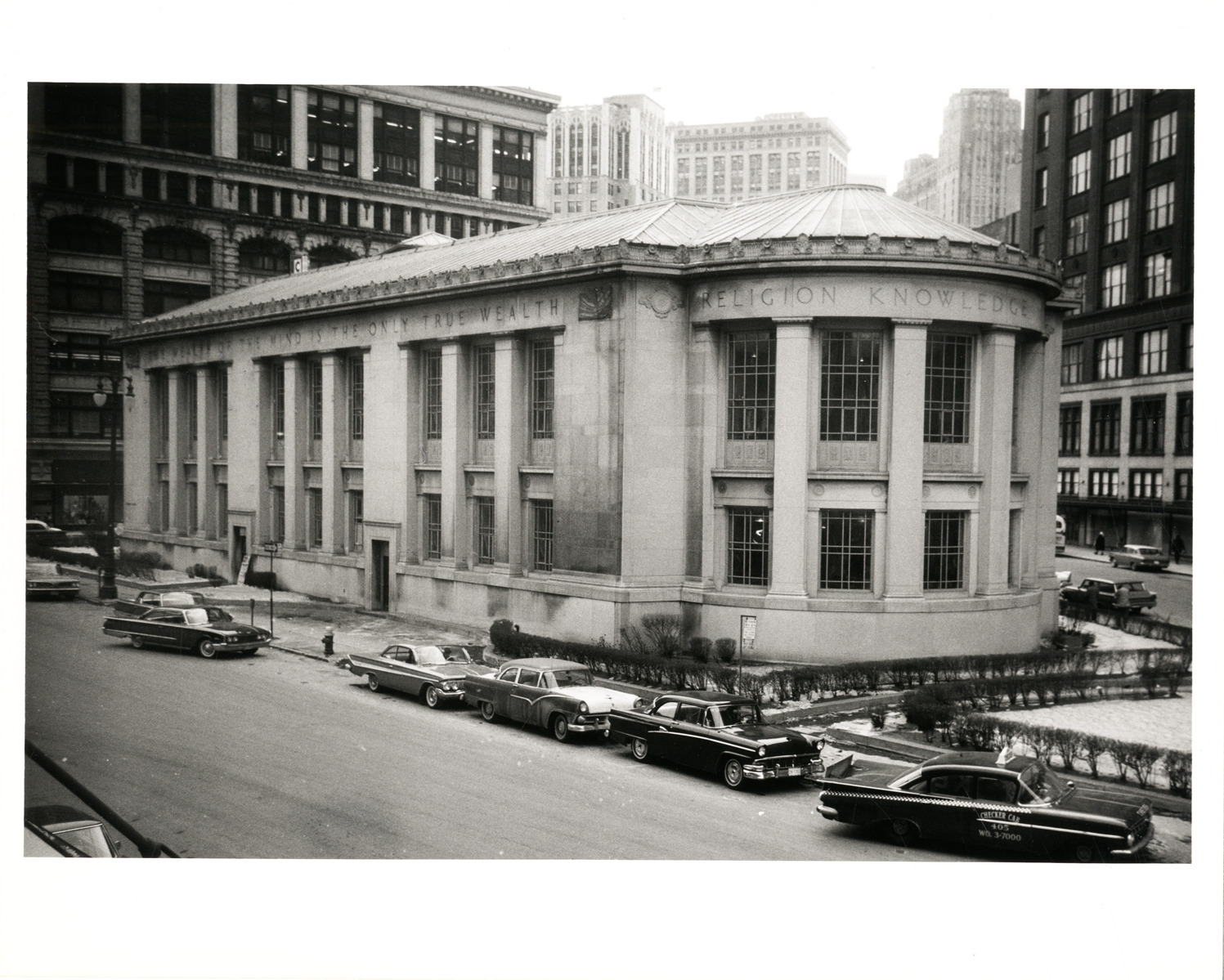 View of the Downtown Library, now known as the Skillman Branch, of the Detroit Public Library. Cars and Checker taxicab are parked in street. Stamped on back: "Benyas-Kaufman photographers. 3775 W. 9 Mile. Oak Park 37, Mich. Phone LI. 8-4400." Handwritten on back: "Jan. 1963."