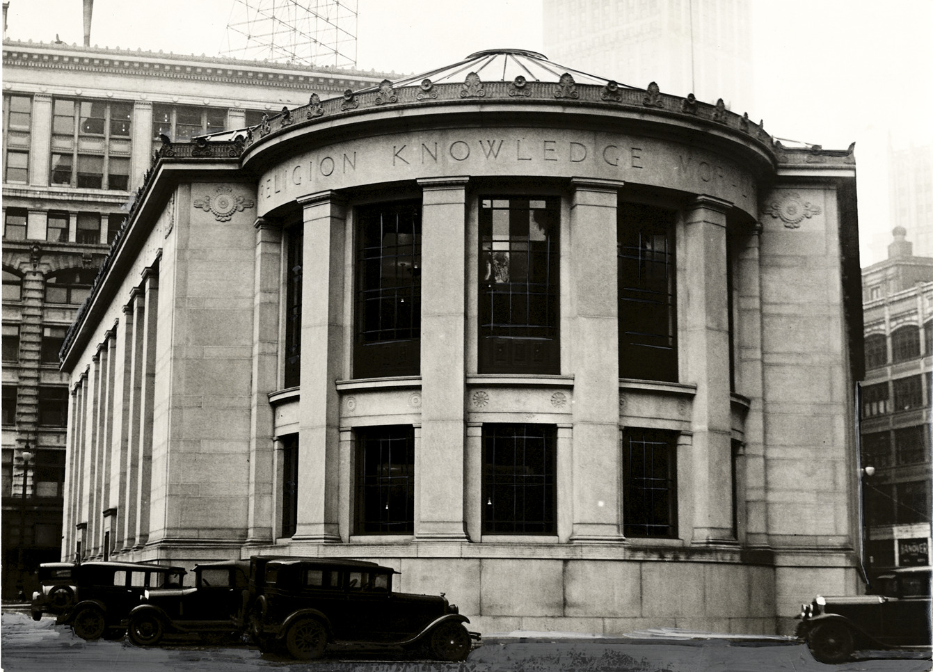 View of the Downtown Library, now known as the Skillman Branch, of the Detroit Public Library. Cars are parked next to building. Handwritten on back: "Libraries, Downtown."