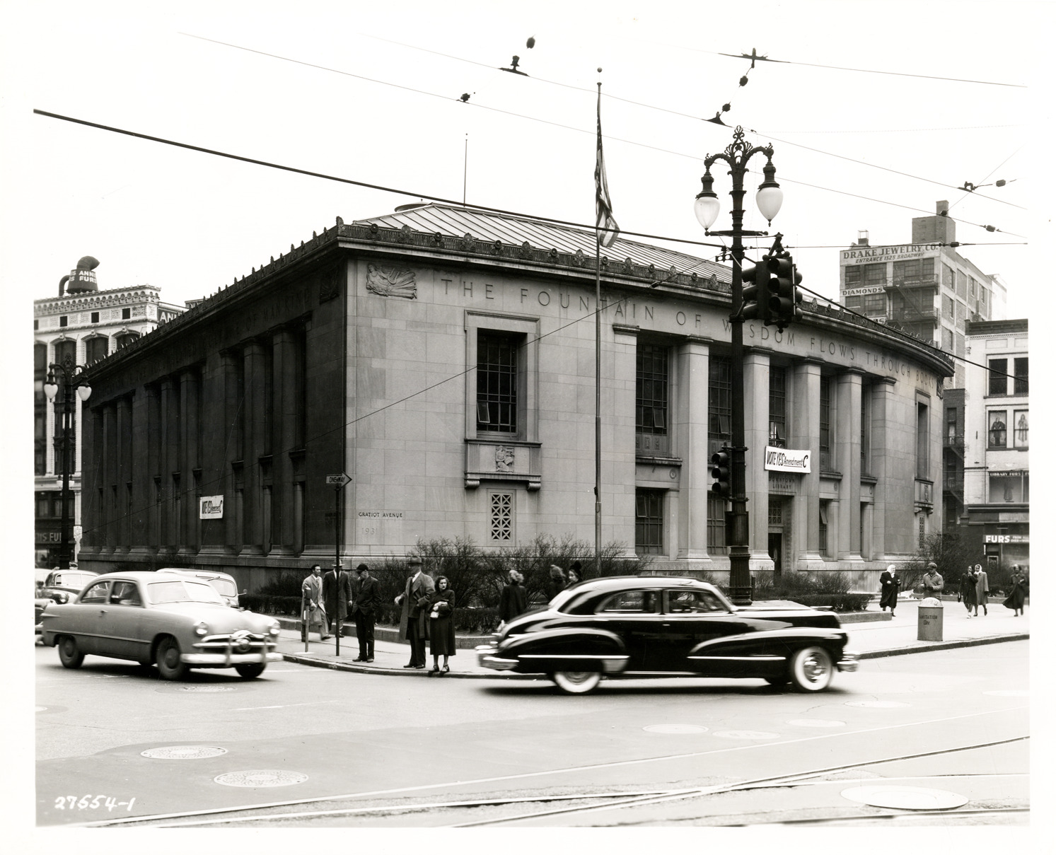 View of the Downtown Library, now known as the Skillman Branch, of the Detroit Public Library. Pedestrians on sidewalk; cars travel past building. "Vote Yes Amendment C" banner is displayed over entrance. Label on back: "Downtown Library with banners 'Vote Yes Amendment C,' March 31, 1949."