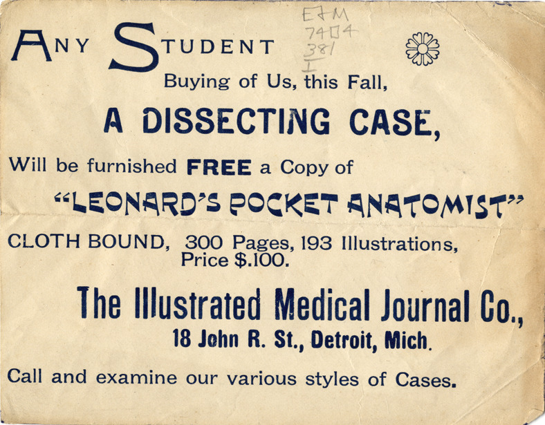 View of an advertising card for the Illustrated Medical Journal Co. Printed on front: "Any student buying of us, this fall, a dissecting case, will be furnished a free a copy of 'Leonard's pocket anatomist,' cloth bound, 300 pages, 193 illustrations, price $1.00. The Illustrated Medical Journal Co., 18 John R St., Detroit, Mich. Call and examine our various styles of cases."