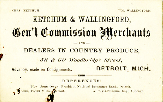 View of a business card for Ketchum & Wallingford. Printed on front: "Chas. Ketchum, Wm. Wallingford. Ketchum & Wallingford, gen'l commission merchants and dealers in country produce. 58 & 60 Woodbridge Street, Detroit, Mich. Advances made on consignments. References: Hon. John Owen, President National Insurance Bank, Detroit. Moore, Foote & Co., Detroit. A. Wallingford, Esq., Chicago."