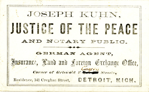 View of a business card for Joseph Kuhn. Printed on front: "Joseph Kuhn, justice of the peace and notary public. German agent, insurance, land and foreign exchange office, corner of Griswold and Congress Streets. Residence, 141 Croghan Street, Detroit, Mich."