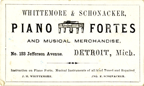 View of a business card for Whittemore & Schonacker. Printed on front: "Whittemore & Schonacker, piano fortes and musical merchandise. No. 123 Jefferson Avenue. Detroit, Mich. Instruction on piano forte. Musical instruments of all kind tuned and repaired. J.H. Whittemore, Jno. E. Schonacker."