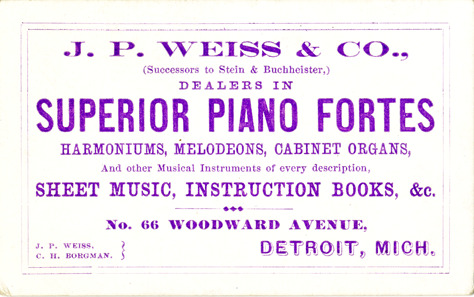 View of a business card for J.P. Weiss & Co. Printed on front: "J.P. Weiss & Co., successors to Stein & Buchheister. Dealers in superior piano fortes, harmoniums, melodeons, cabinet organs, and other musical instruments of every description, sheet music, instruction books, &c. No. 66 Woodward Avenue, Detroit, Mich. J.P. Weiss, C.H. Borgman."