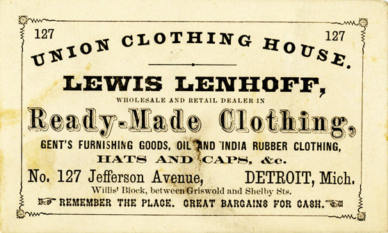 View of a business card for Lewis Lenhoff. Printed on front: "Lewis Lenhoff, wholesale and retail dealer in ready-made clothing, gent's furnishing goods, oil and India rubber clothing, hats and caps, &c. Union clothing house. No. 127 Jefferson Avenue, Detroit, Mich. Willis Block, between Griswold and Shelby Sts. Remember this place, great bargains for cash."