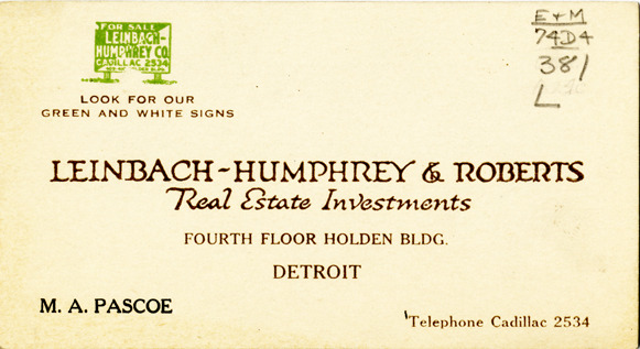 Favorite this☆ Business card for Leinbach-Humphrey & Roberts Description: View of a business card for Leinbach-Humphrey & Roberts. Printed on front: "Leinbach-Humphrey & Roberts. Real estate investments. Fourth floor Holden Bldg., Detroit. M.A. Pascoe. Telephone Cadillac 2534. Look for our green and white signs." Details Resource ID: bh015004 Subject: Real estate agents--Michigan--Detroit Business cards Date Issued: Unknown year Format: 1 business card ; 2.25 x 4 in. Member of: Burton Historical Collection Filing Location: E&M 977.4D4 381 L Rights: Physical rights are retained by DPL. Copyright is retained in accordance with U.S. copyright laws.
