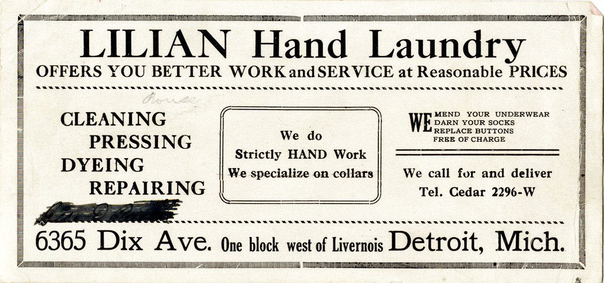 View of an advertising card for Lilian Hand Laundry. Printed on front: "Lilian Hand Laundry offers you better work and service at reasonable prices. Cleaning, pressing, dyeing, repairing. We do strictly hand work. We specialize on collars. We mend your underwear, darn your socks, replace buttons free of charge. We call for and deliver Tel. Cedar 2296-W. 6365 Dix Ave. One block west of Livernois. Detroit, Mich."