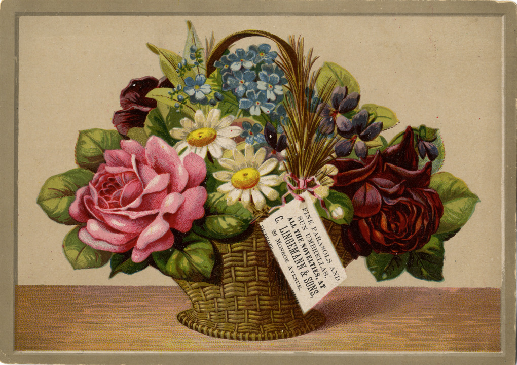 Favorite this☆ Advertising card for C. Lingemann & Sons Description: View of an advertising card for C. Lingemann & Sons, depicting a basket of flowers. Printed on front: "Fine parasols and sun umbrellas, all the novelties, at C. Lingemann & Sons, 26 Monroe Avenue, Detroit, Mich." Details Resource ID: bh015023 Subject: Umbrella industry--Michigan--Detroit Flowers in art Baskets in art Advertising cards Date Issued: Unknown year Format: 1 advertising card : col. ; 4.75 x 6.75 in. Member of: Burton Historical Collection Filing Location: E&M 977.4D4 381 L Rights: Physical rights are retained by DPL. Copyright is retained in accordance with U.S. copyright laws.