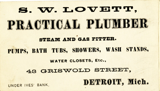 View of a business card for S.W. Lovett. Printed on front: "S.W. Lovett, practical plumber. Steam and gas fitter. Pumps, bath tubs, showers, wash stands, water closets, etc., 43 Griswold Street, Detroit, Mich. Under Ives' Bank."