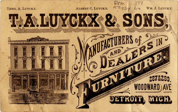 Favorite this☆ Business card for T.A. Luyckx & Sons Description: View of a business card for T.A. Luyckx & Sons, depicting the building. Printed on front: "T.A. Luyckx & Sons, manufacturers of and dealers in furniture. 287 & 289 Woodward Ave., Detroit, Mich. Theo. A. Luyckx, Albert C. Luyckx, Wm. J. Luyckx. Details Resource ID: bh015042 Subject: Taxidermists--Michigan--Detroit Buildings in art Business cards Date Issued: Unknown year Format: 1 business card ; 3 x 4.75 in. Member of: Burton Historical Collection Filing Location: E&M 977.4D4 381 L Rights: Physical rights are retained by DPL. Copyright is retained in accordance with U.S. copyright laws.