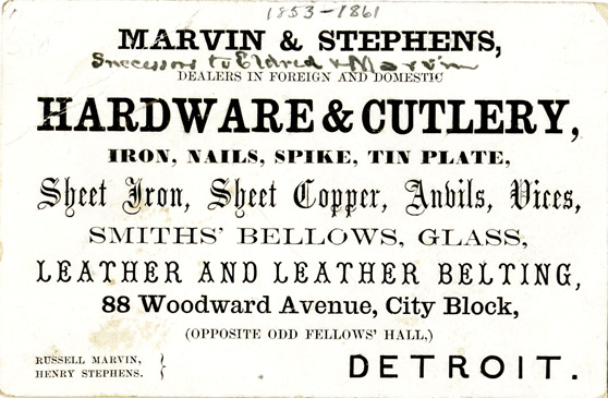 View of a business card for Marvin & Stephens. Printed on front: "Marvin & Stephens, successors to Eldred & Marvin. Dealers in foreign and domestic hardware & cutlery, iron, nails, spike, tin plate, sheet iron, sheet copper, anvils, vices, smiths' bellows, glass, leather and leather belting, 88 Woodward Avenue, City Block, opposite Odd Fellows' Hall, Detroit. Russell Marvin, Henry Stephens."