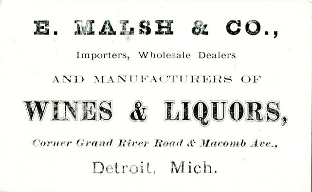 Favorite this☆ Business card for E. Malsh & Co. Description: View of a business card for E. Malsh & Co. Printed on front: "E. Malsh & Co., importers, wholesale dealers and manufacturers of wines & liquors, corner Grand River Road & Macomb Ave., Detroit, Mich." Details Resource ID: bh015055 Subject: Vintners--Michigan--Detroit Liquor industry--Michigan--Detroit Business cards Date Issued: Unknown year Format: 1 business card ; 2.75 x 4.25 in. Member of: Burton Historical Collection Filing Location: E&M 977.4D4 381 M Rights: Physical rights are retained by DPL. Copyright is retained in accordance with U.S. copyright laws.