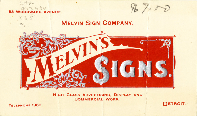 Favorite this☆ Business card for Melvin Sign Company Description: View of a business card for Melvin Sign Company. Printed on front: "Melvin Sign Company. Melvin's Signs. 83 Woodward Avenue. High class advertising, display and commercial work. Detroit. Telephone 1960." Details Resource ID: bh015061 Subject: Signs and signboards--Michigan--Detroit--Design and construction Business cards Date Issued: Unknown year Format: 1 business card : col. ; 3.25 x 5.5 in. Member of: Burton Historical Collection Filing Location: E&M 977.4D4 381 M Rights: Physical rights are retained by DPL. Copyright is retained in accordance with U.S. copyright laws.