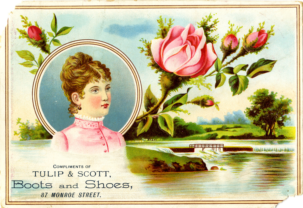 View of an advertising card for Tulip & Scott, depicing a woman, roses and a river. Printed on front: "Compliments of Tulip & Scott, boots & shoes, 87 Monroe Street."