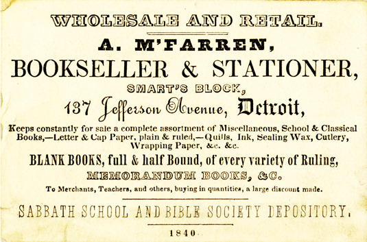 View of a business card for A. M'Farren. Printed on front: "Wholesale and retail. A. M'Farren, bookseller & stationery, Smart's Block, 137 Jefferson Avenue, Detroit. Keeps constantly for sale a complete assortment of miscellaneous, school & classical books, letter & cap paper, plain & ruled, quills, ink, sealing wax, cutlery, wrapping paper, &c. &c. Blank books, full & half bound, of every variety of ruling, memorandum books, &c. To merchants, teachers, and others, buying in quantities, a large discount made. Sabbath School & Bible Society depository. 1840."