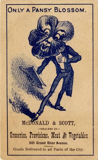 View of an advertising card for McDonald & Scott, depicting a man with the head of a pansy blossom, reading a document. Printed on front: "McDonald & Scott, dealers in groceries, provisions, meat and vegetables. 501 Grand River Avenue. Goods delivered to all parts of the city. Only a pansy blossom."