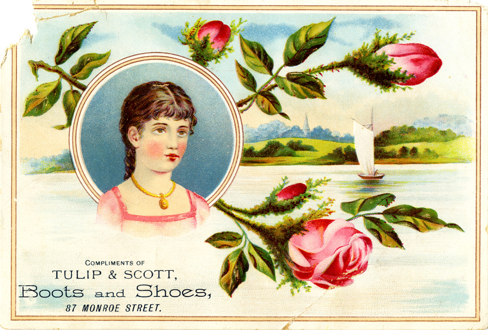 Favorite this☆ Advertising card for Tulip & Scott Description: View of an advertising card for Tulip & Scott, depicing a woman, roses and a sailboat on river. Printed on front: "Compliments of Tulip & Scott, boots & shoes, 87 Monroe Street." Details Resource ID: bh015075 Subject: Shoe stores--Michigan--Detroit Advertising--Shoes Women in advertising Roses in art Sailboats in art Advertising cards Date Issued: Unknown year Format: 1 advertising card : col. ; 4.5 x 6.5 in. Member of: Burton Historical Collection Filing Location: E&M 977.4D4 381 T Rights: Physical rights are retained by DPL. Copyright is retained in accordance with U.S. copyright laws.