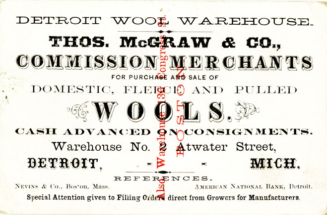 View of a business card for Thos. McGraw & Co. Printed on front: "Thos. McGraw & Co., commission merchants for purchase and sale of domestic, fleece and pulled wools. Detroit wool warehouse. Cash advanced on consignments. Warehouse no. 2 Atwater Street, Detroit, Mich. References. Nevins & Co., Boston, Mass. American National Bank, Detroit. Special attention given to filling orders direct from growers for manufacturers. Also warehouse 136 Congress St. Boston."