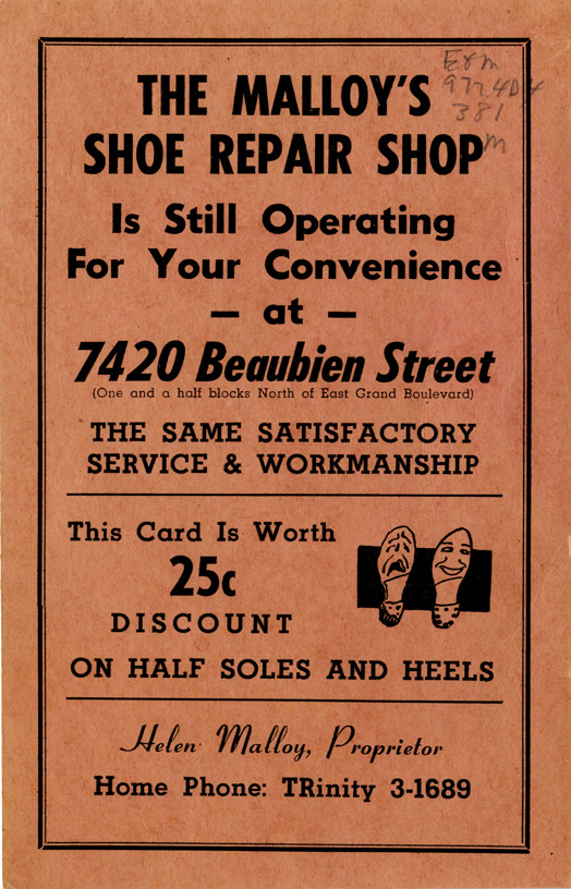 View of an advertising card for Malloy's Shoe Repair Shop. Printed on back: "The Malloy's Shoe Repair Shop is still operating for your convenience at 7420 Beaubien Street. One and a half blocks north of East Grand Boulevard. The same satisfactory service & workmanship. This card is worth 25 [cents] discount on half soles and heels. Helen Malloy, proprietor. Home phone: Trinity 3-1689."