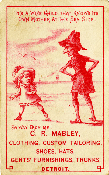 View of an advertising card for C.R. Mabley, depicting a woman and girl at the beach. Printed on front: "It's a wise child that knows its own mother at the sea side. Go way from me! C.R. Mabley, clothing, custom tailoring, shoes, hats, gents' furnishings, trunks, Detroit."