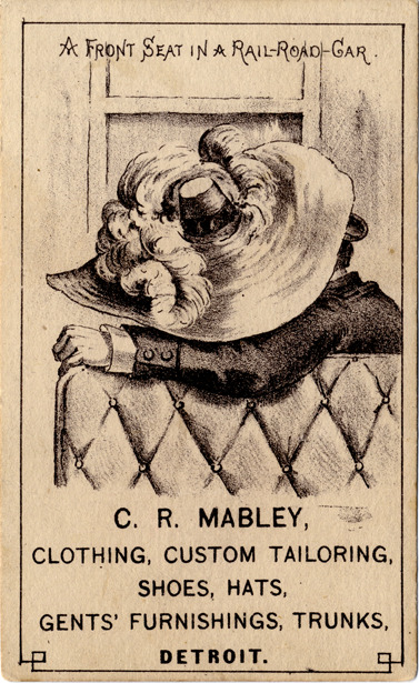 View of an advertising card for C.R. Mabley, depicting a man and woman embracing, obscured by a large hat. Printed on front: "A front seat in a rail-road-car." C.R. Mabley, clothing, custom tailoring, shoes, hats, gents' furnishings, trunks, Detroit."