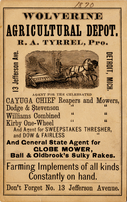View of an advertising card for R.A. Tyrrel, depicting a Kirby horse-drawn reaper. Printed on front: "Wolverine Agricultural Depot. R.A. Tyrell, pro. 13 Jefferson Ave., Detroit, Mich. Agent for the celebrated Cayuga Chief reapers and mowers, Dodge & Stevenson, Williams Combined, Kirby One-Wheel and agent for Sweepstakes thresher, and Dow & Fairless and general state agent for Globe mower, Ball & Oldbrook's sulky rakes. Farming implements of all kinds constantly on hand. Don't forget No. 13 Jefferson Avenue." Handwritten on front: "1870."
