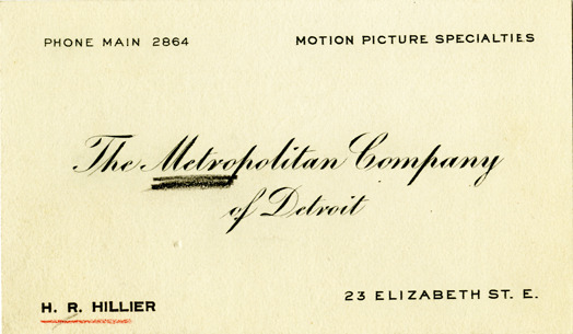 Favorite this☆ Business card for Metropolitan Company of Detroit Description: View of a business card for Metropolitan Company of Detroit. Printed on front: "The Metropolitan Company of Detroit. Motion picture specialties. 23 Elizabeth St. E. Phone Main 2864. H.R. Hillier." Details Resource ID: bh015108 Subject: Motion picture industry--Michigan--Detroit Business cards Date Issued: Unknown year Format: 1 business card ; 2 x 3.5 in. Member of: Burton Historical Collection Filing Location: E&M 977.4D4 381 M Rights: Physical rights are retained by DPL. Copyright is retained in accordance with U.S. copyright laws.