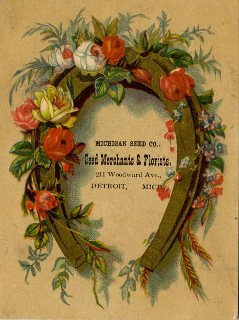 Favorite this☆ Advertising card for Michigan Seed Co. Description: View of an advertising card for Michigan Seed Co., depicting flowers on a horseshoe. Printed on front: "Michigan Seed Co. Seedsmen and florists, 211 Woodward Ave., Detroit, Mich." Details Resource ID: bh015121 Subject: Seed industry and trade--Michigan--Detroit Florists--Michigan--Detroit Flowers in art Advertising cards Date Issued: Unknown year Format: 1 advertising card : col. ; 4.5 x 3.25 in. Member of: Burton Historical Collection Filing Location: E&M 977.4D4 381 M Rights: Physical rights are retained by DPL. Copyright is retained in accordance with U.S. copyright laws.