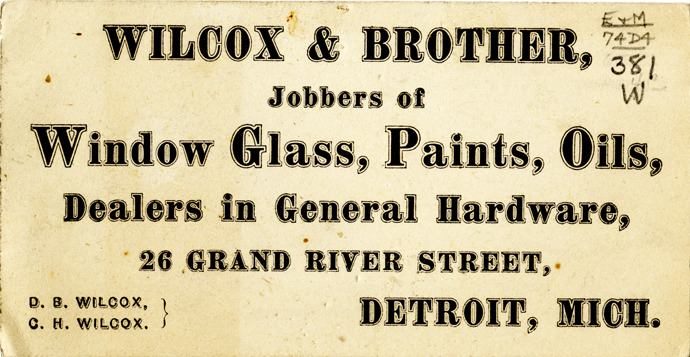 View of a business card for Wilcox & Brother. Printed on front: "Wilcox & Brother, jobbers of window glass, paints, oils, dealers in general hardware, 26 Grand River Street, Detroit, Mich. D.B. Wilcox, C.H. Wilcox." Handwritten shopping list on back.