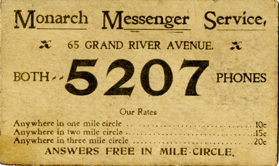 View of a business card for Monarch Messenger Service. Printed on front: "Monarch Messenger Service. 65 Grand River Avenue. Both 5207 phones. Our rates. Anywhere in one mile circle, 10 [cents]. Anywhere in two mile circle, 15 [cents]. Anywhere in three mile circle, 20 [cents]. Answers free in mile circle."