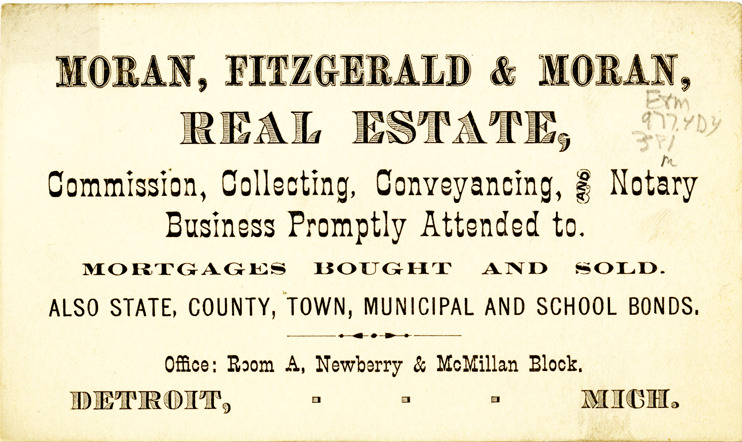 View of a business card for Moran, Fitzgerald & Moran. Printed on front: "Moran, Fitzgerald & Moran, real estate, commission, collecting, conveyancing and notary business promptly attended to. Mortgages bought and sold. Also state, county, town, municipal and school bonds. Office: Room A, Newberry & McMillan Block. Detroit, Mich."