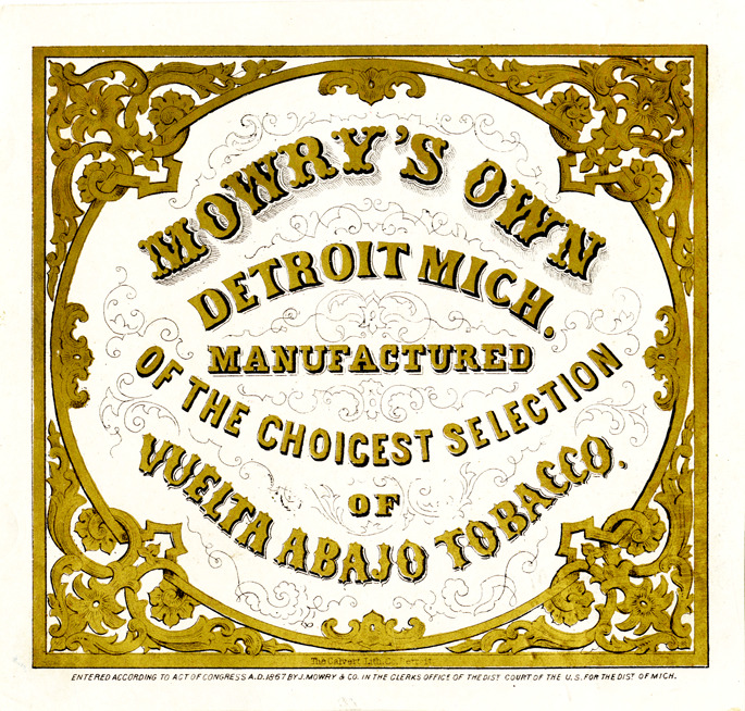 View of an advertising card for I. Mowry & Co. Printed on front: "Mowry's own Detroit Mich. manufactured of the choicest selection of Vuelta Abajo tobacco. Entered according to act of Congress in the year 1867 by J. [sic] Mowry & Co. in the Clerks Office in the Dist. Court of the U.S. for the Dist. of Mich. The Calvert Lith. Co. Detroit."