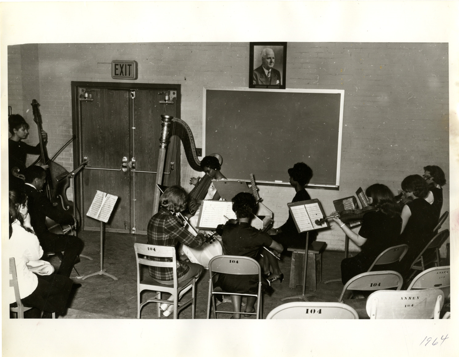 View of harpist Onita Sanders at final examination and graduation recital at Cass Technical High School. Musicians in foreground; chalkboard in background. Handwritten on front: "1964." Handwritten on back: "Onita Sanders, harp. Final examination, graduation recital, March 26, 1964. Cass Tech H.S. Room 104 Music Annex. Patricia Terry at the celeste. Velma Froude, instructor."