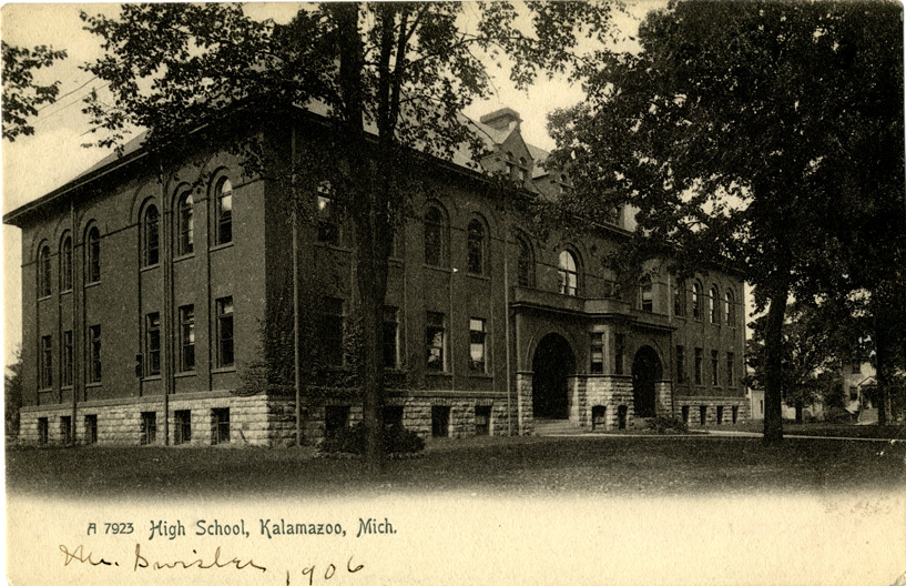 Favorite this☆ High School, Kalamazoo, Michigan Description: View of the High School in Kalamazoo, Michigan. Printed on front: "A 7923. High School, Kalamazoo, Mich." Handwritten on front: "Mr. Swisler, 1906." Printed on back: "The Rotograph Co., N.Y., City, (Germany)." Details Resource ID: bh015212 Subject: High school buildings--Michigan--Kalamazoo Postcards Publisher: Rotograph Co. Date Issued: 1906 (year approximate) Format: 1 postcard ; 3.5 x 5.5 in. Member of: Burton Historical Collection Filing Location: M/Localities-Kalamazoo Rights: Physical rights are retained by DPL. Copyright is retained in accordance with U.S. copyright laws.