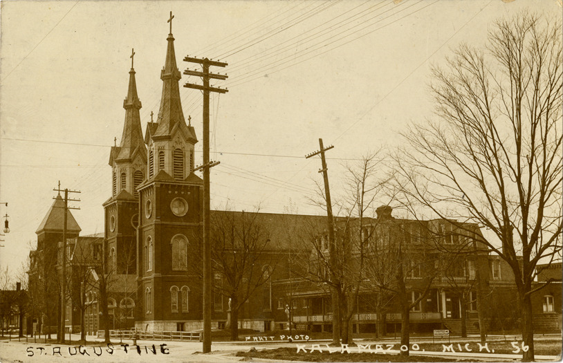View of St. Augstine's Catholic Church in Kalamazoo, Michigan. Printed on front: "St. Augustine. Kalamazoo, Mich. Pratt photo." Handwritten on back: "This is St. Augustine Church where I am [undecipherable] during these 3 days of Holy Week. A retreat is being is being conducted at Nazareth at present so I am not needed here till Easter. I'm always glad to get back to the Academy. Best regards from your cousin, A.C. [undecipherable]."